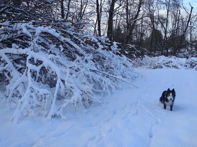 But across the road there was a mess to clean up. The snow was wet and heavy and branches brought down some powerlines. Ours went out the next morning. We made sure we didn't walk under any trees, and detoured out into another neighbour's field to avoid some.